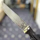 - Нож Зла, выполненный из рога буйвола, дамасской стали и бивня мамонта, отличается мощью и загадочностью, а его украшение – резным шпинелью в огранке кабошон – добавляет образу драматизма.